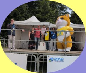 Photo de Maëlys et ses parents et avec les bénévoles et la mascotte.